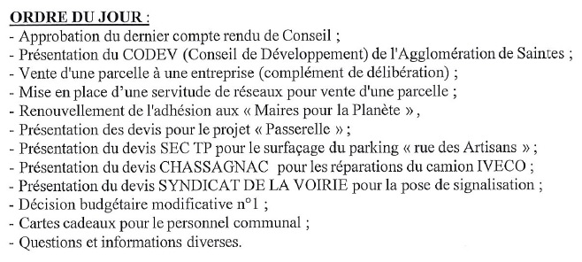 conseil municipal du 04 novembre 2025 Le Conseil Municipal se réunira le mardi 04 novembre 2025 à 19h00. Consultez l’ordre du jour : + Ajouter à mon Agenda Google + iCal / Outlook export 00 jours 00 heures 00 minutes 00 secondes Date 04 Nov 2025 Heure 19:00 Lieu Salle du Conseil Municipal Mairie d'Ecoyeux Partagez cet événement octobre 2025 Oct 29 2025 Fermeture exceptionnelle de la mairie Oct 31 2025 Soirée d’inaugurations et feu d’artifice novembre 2025 Nov 04 2025 conseil municipal du 04 novembre 2025 Salle du Conseil Municipal Nov 11 2025 Commémoration du 11 novembre Pas d'événement actuellement programmé.