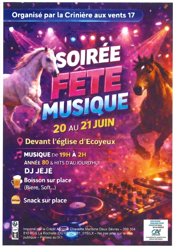 L’Association Crinière aux vents 17 organise une soirée « fête de la musique » le samedi 20 juin 2026.